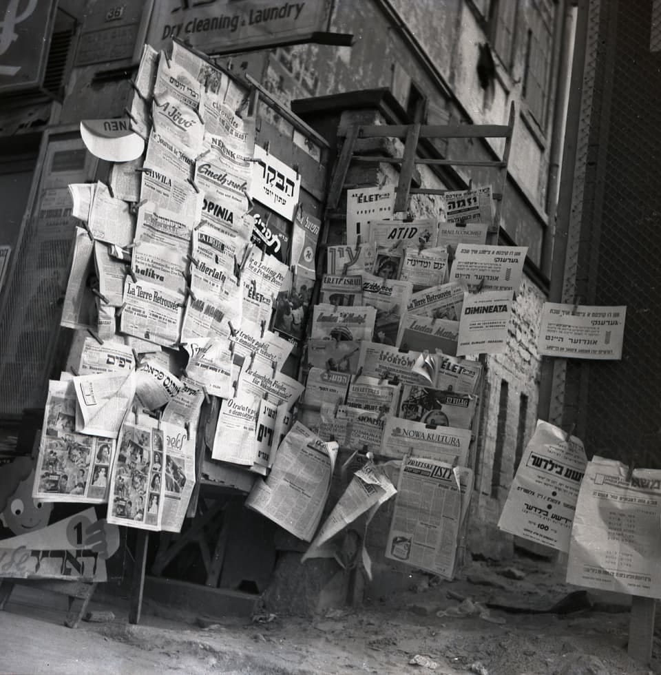 Jews love their news: A classic newsstand photographed by Beno Rothenberg. (National Library of Israel.)